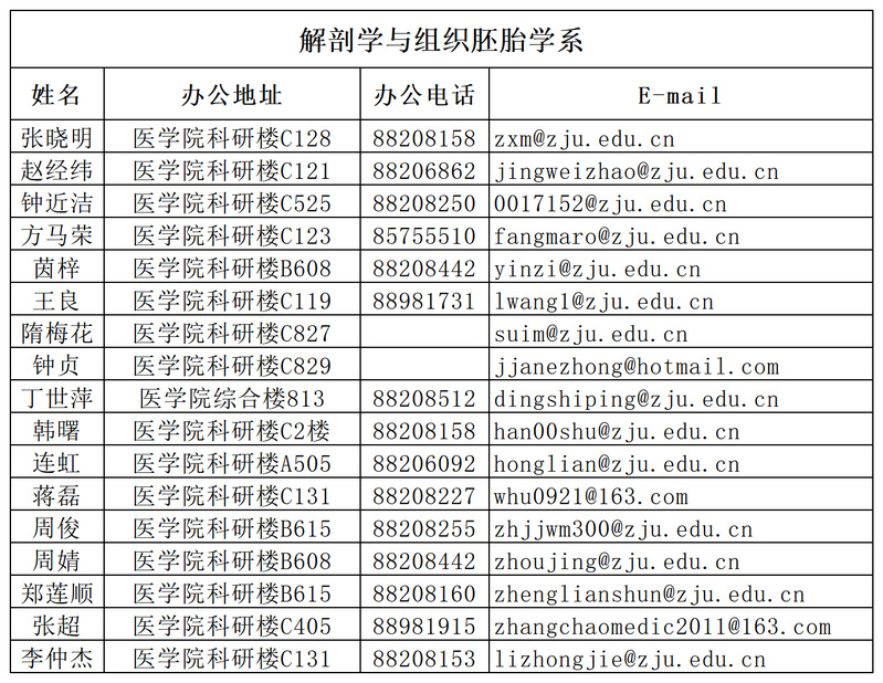 浙江大学医学院基础医学院人体解剖与组织胚胎学系传统上一直承担着重要的教学任务,目前共开设本科生和研究生课程30门,涌现了国家教学名师及国家级一流课程负责人。不仅如此,学科同时在科研方面也取得了令人瞩目的成绩并正在快速发展。曾获1978年全国科技大会一等奖1项、中国国家教委科技进步一等奖1项、中国高校自然科学一等奖1项、省部级科技进步一等奖1项。学科系的老师积极申请科研基金,在过去4年中获得国家自然科学基金创新群体项目1项、国家自然科学基金面上项目12项、国家自然科学基金青年项目4项、国家级重点项目1项。瞄准重要的研究方向开展多样化的研究,学术氛围浓郁,学术水平逐年提高。