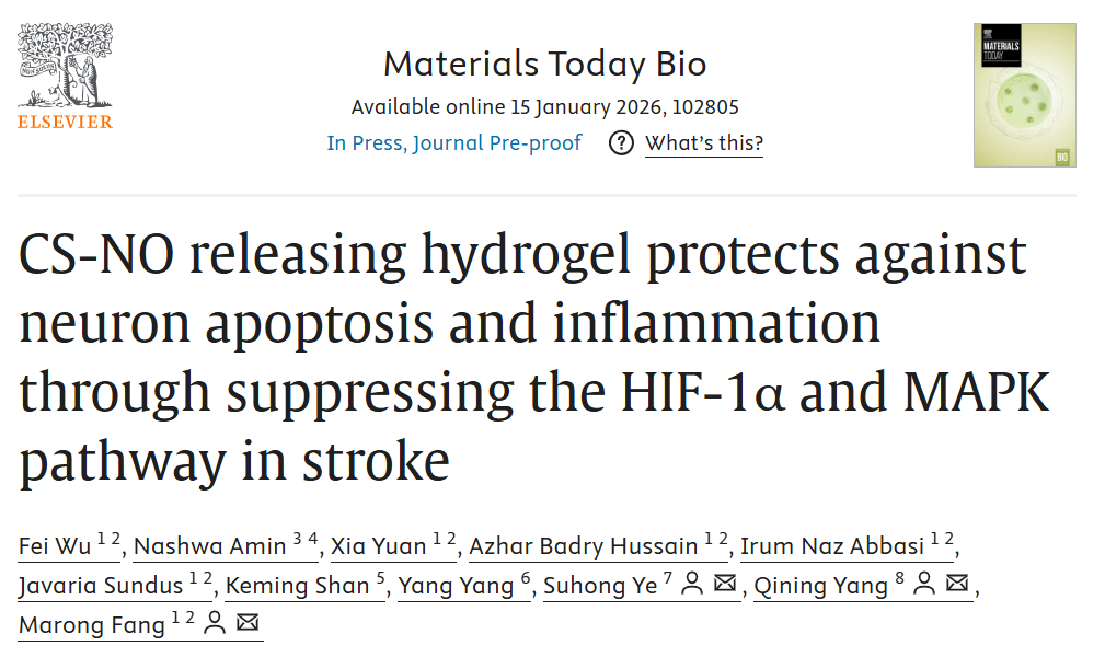 2026年1月15日,方马荣、叶素红和杨骐宁团队在Materials Today Bio期刊上发表题为“CS-NO releasing hydrogel protects against neuron apoptosis and inflammation through suppressing the HIF-1α and MAPK pathway in stroke”的研究论文,系统揭示了一种壳聚糖基一氧化氮释放水凝胶(CS-NO)在缺血性脑卒中后的神经保护的分子机制。